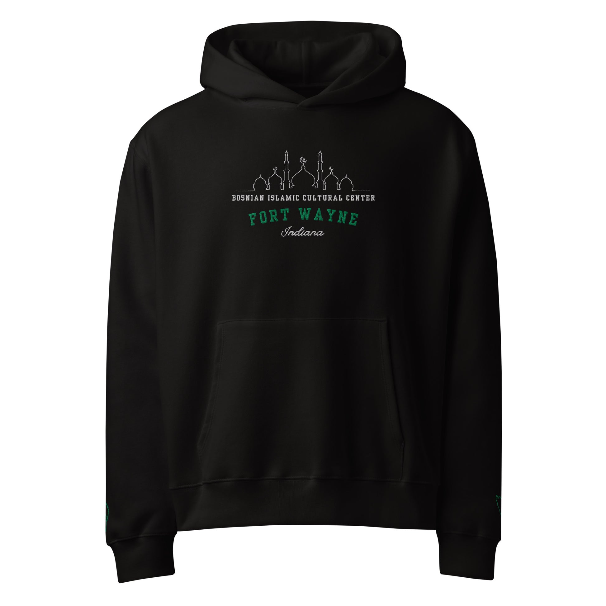 Introducing the Bosnian Islamic Cultural Center (BICC) Hoodie, dedicated to the Bosnian community of Fort Wayne, Indiana. This soft sweatshirt features embroidered designs, both on the chest (with embroidered lettering + design), and the left and right wrist (with the moon & star, and an outline of Bosnia).